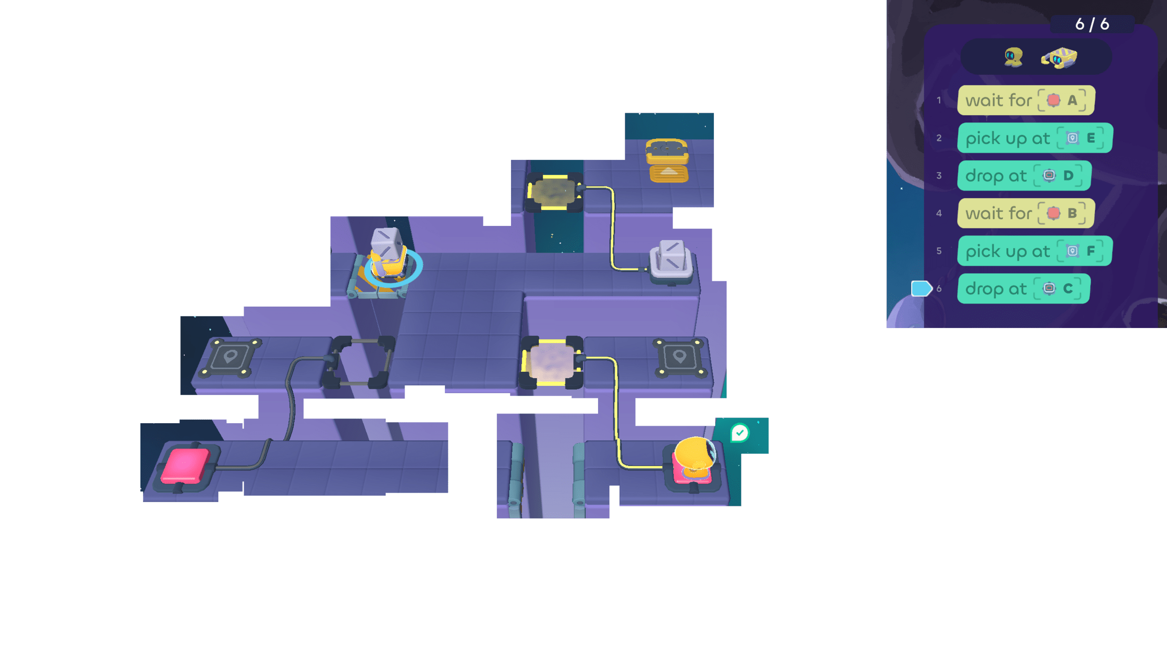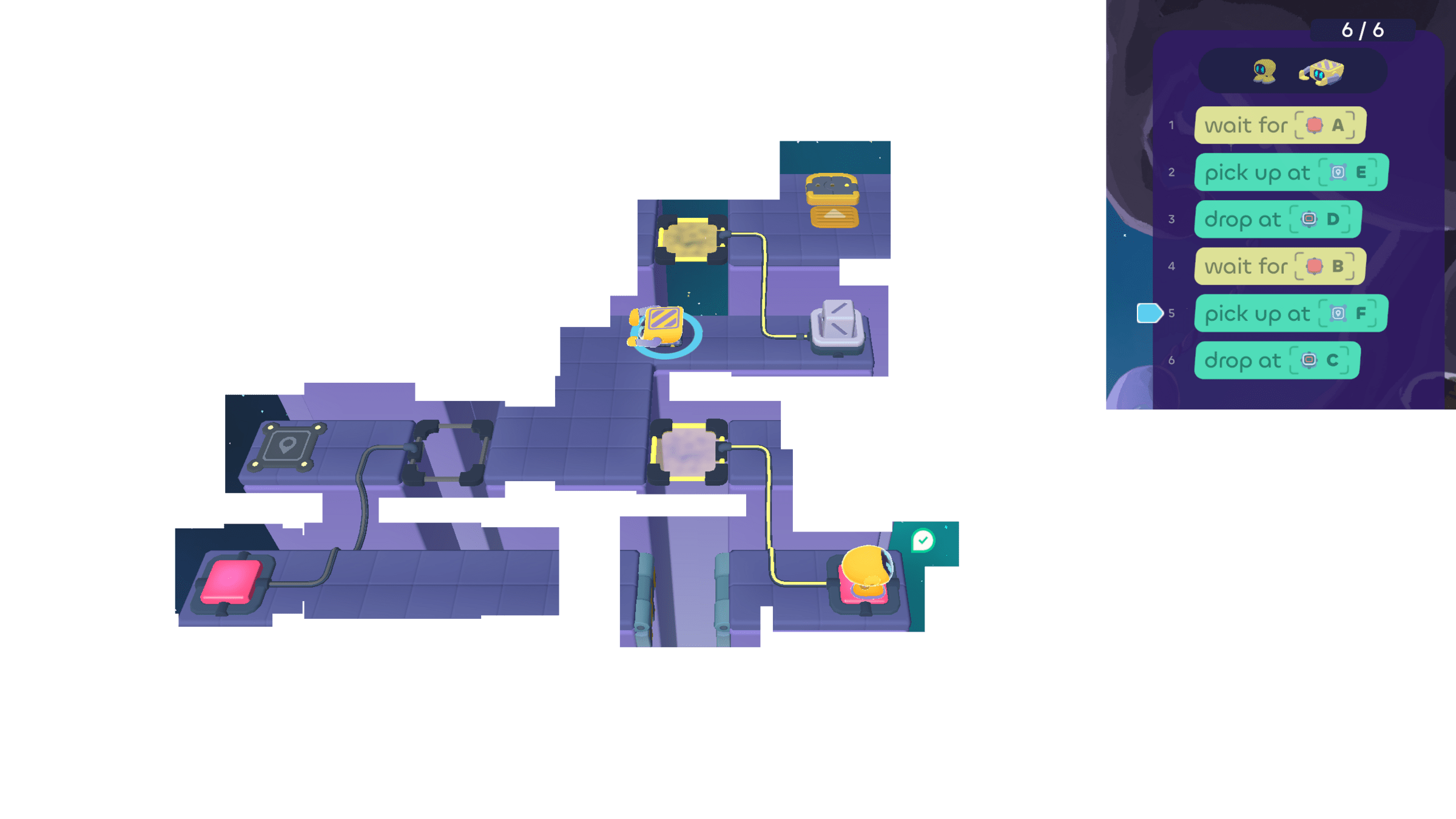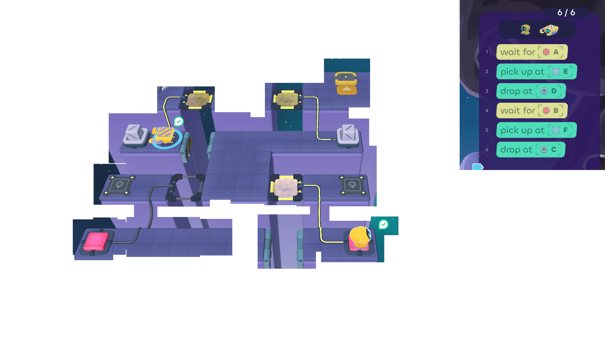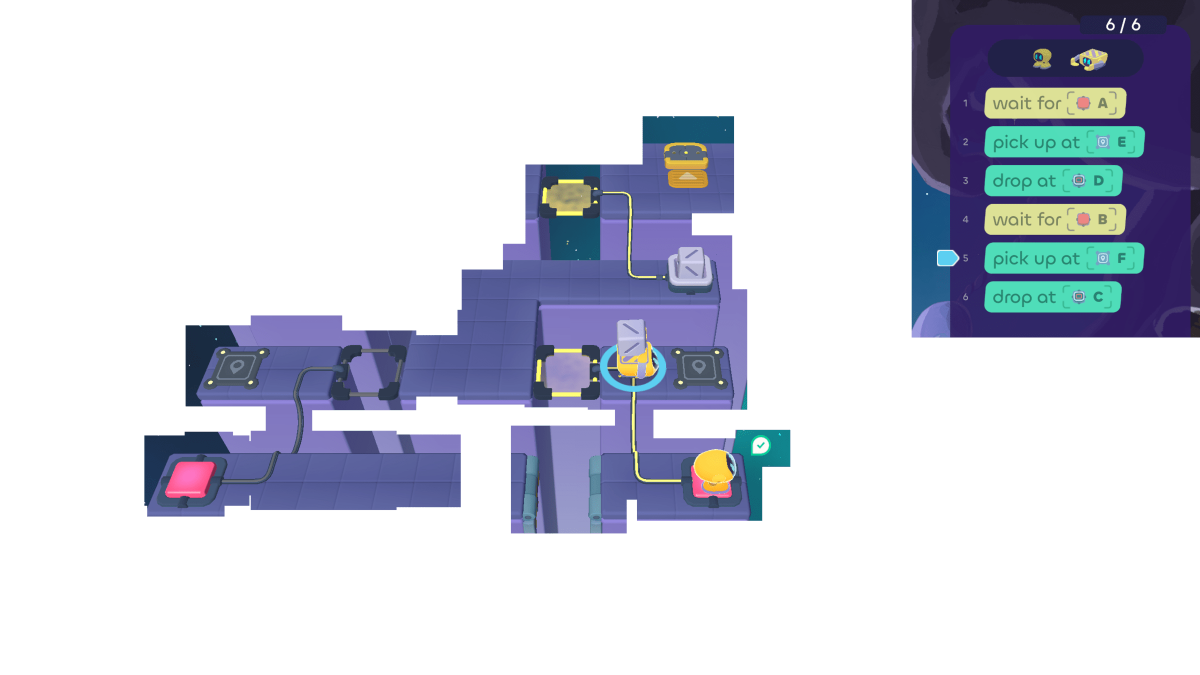 But the Walker can wait for the Grabber. Since the Grabber ends its turn by using cube tray D, the Walker can "wait for D" .