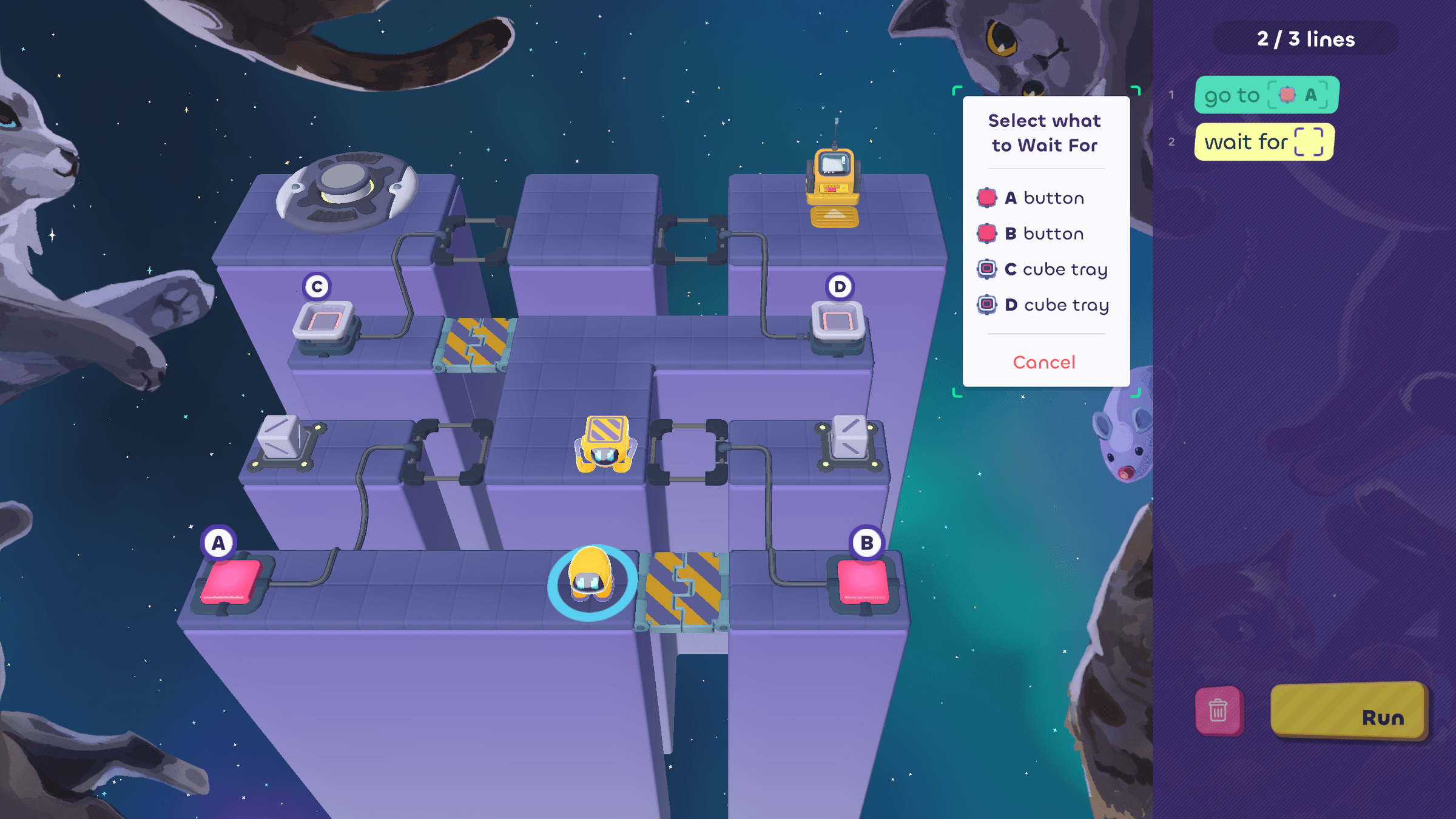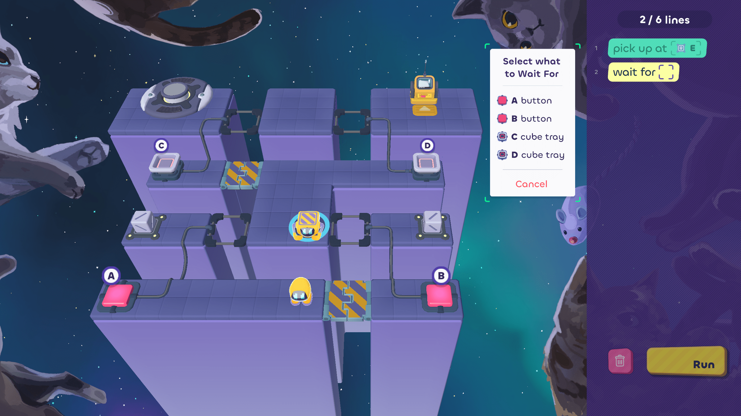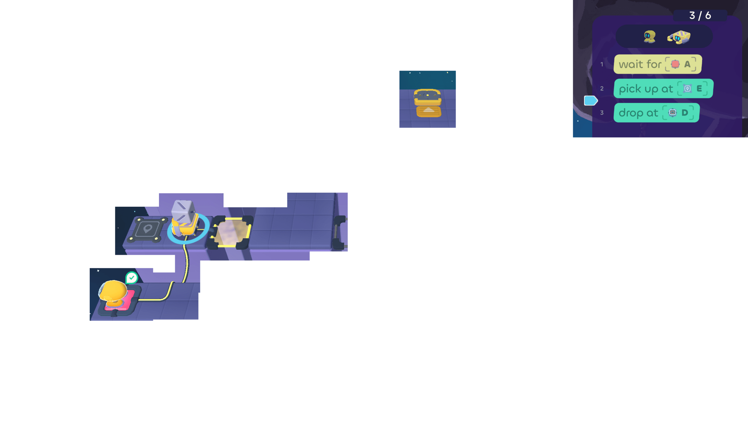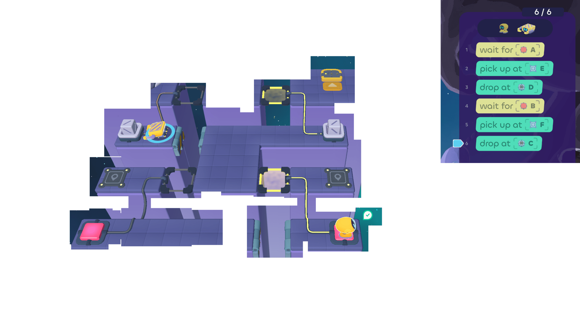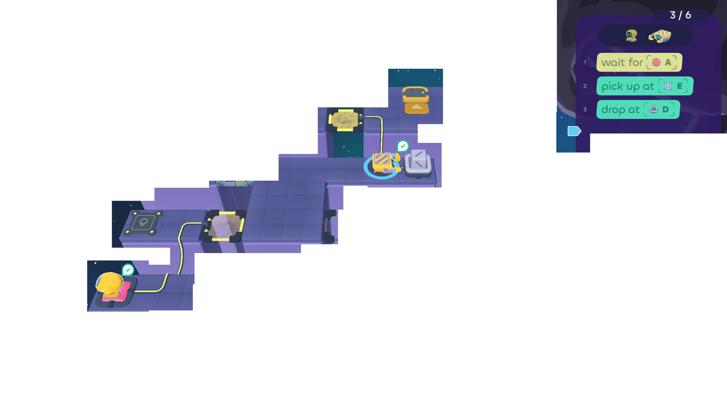 But the Walker can wait for the Grabber. Since the Grabber ends its turn by using cube tray D, the Walker can "wait for D" .