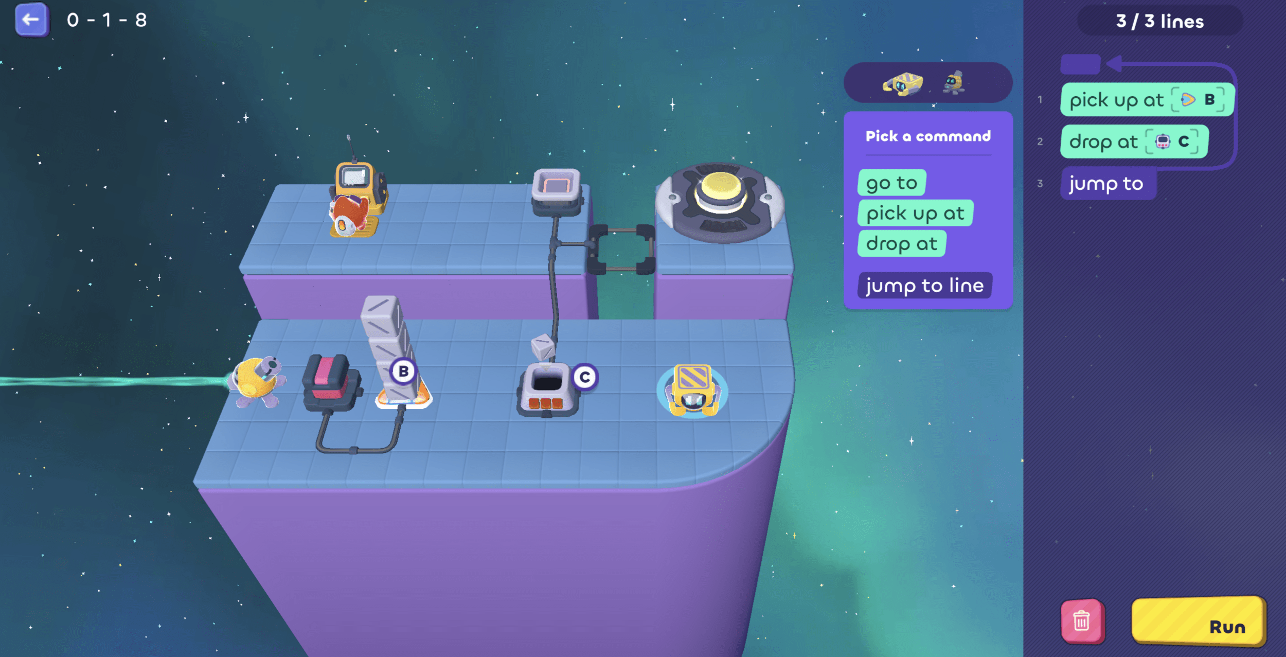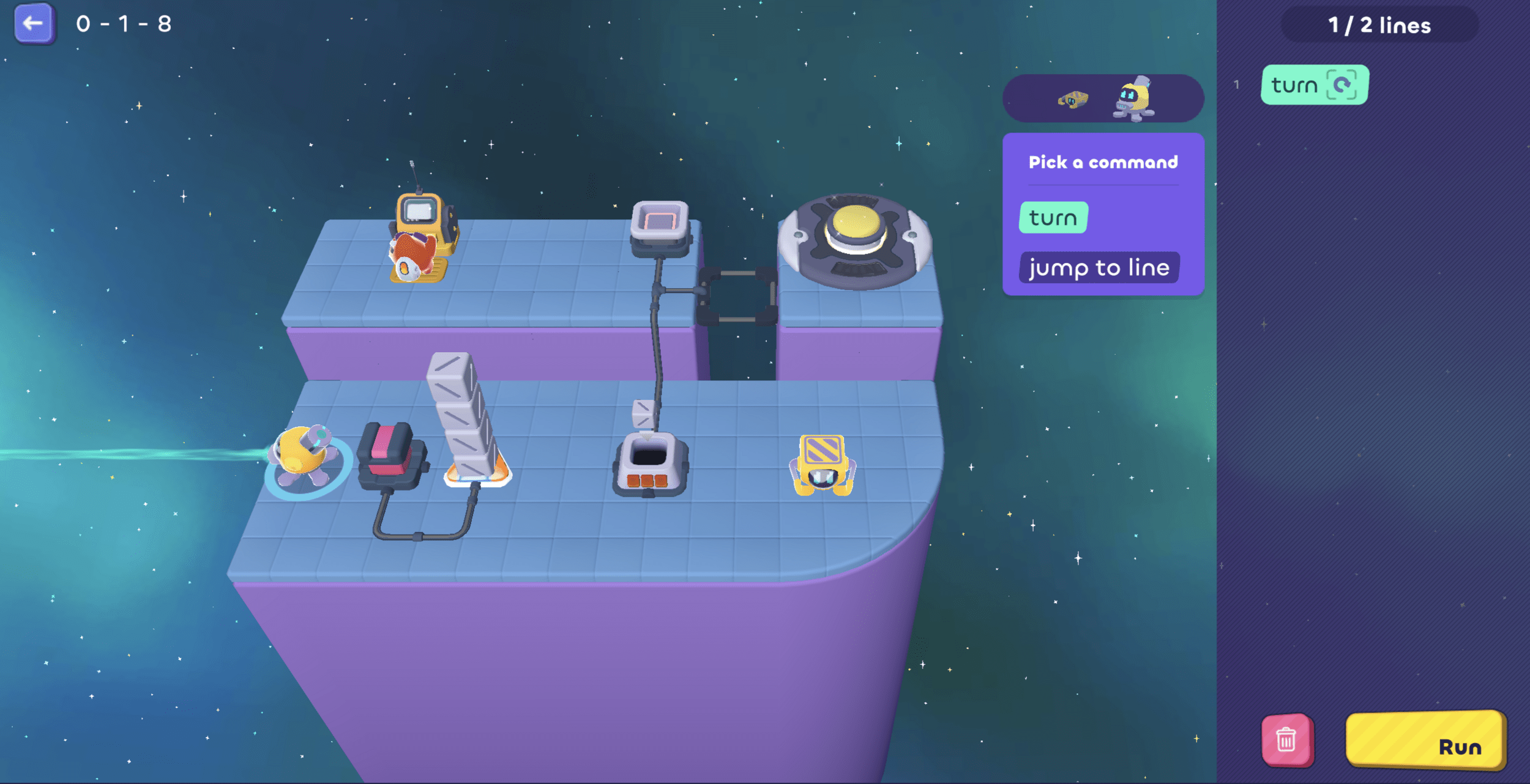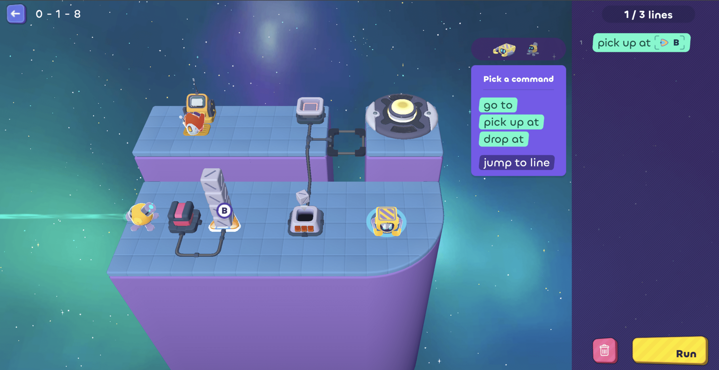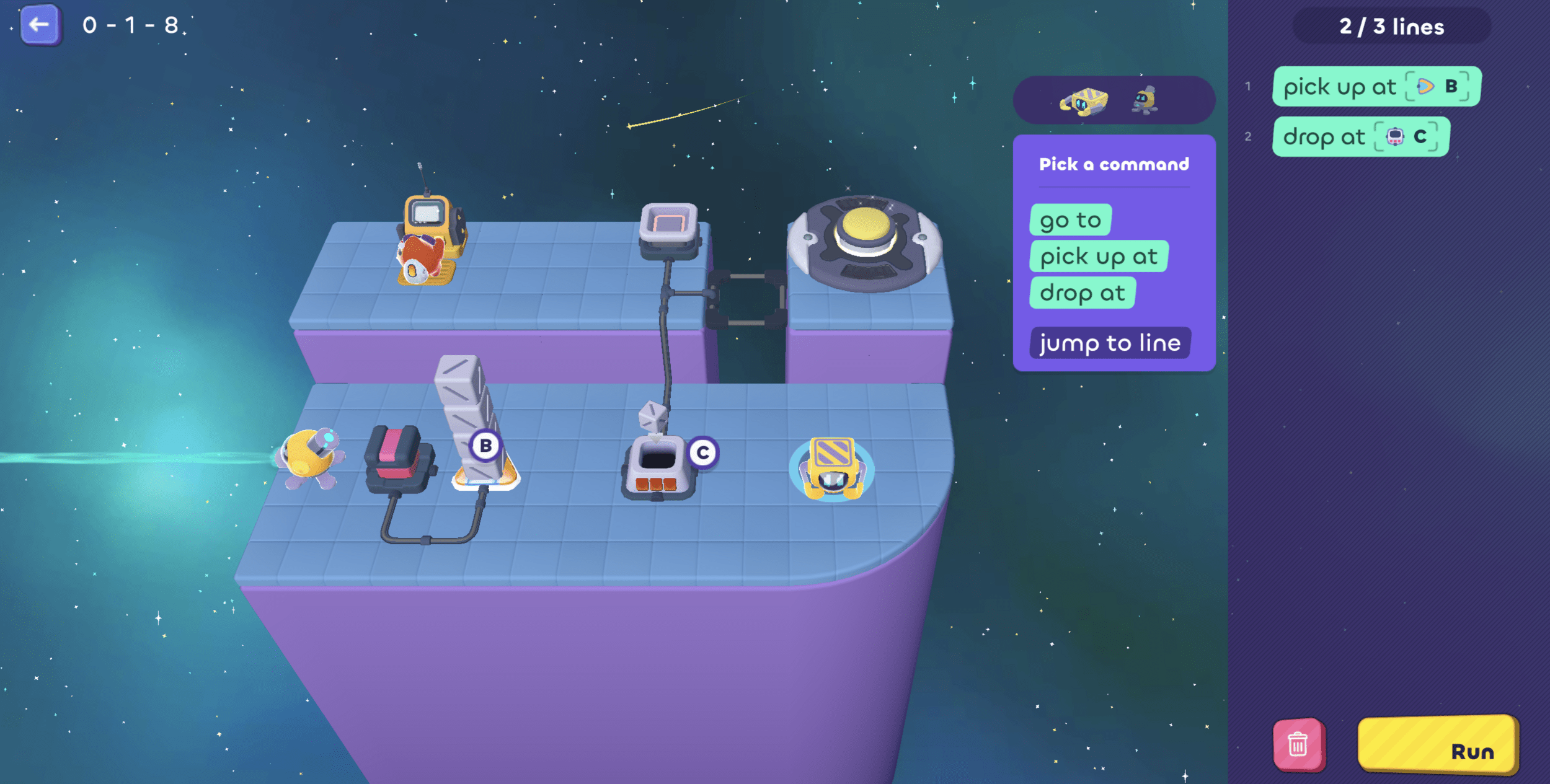 Then it needs to go pick up another cube...oh! But we only have 1 line left, so...
