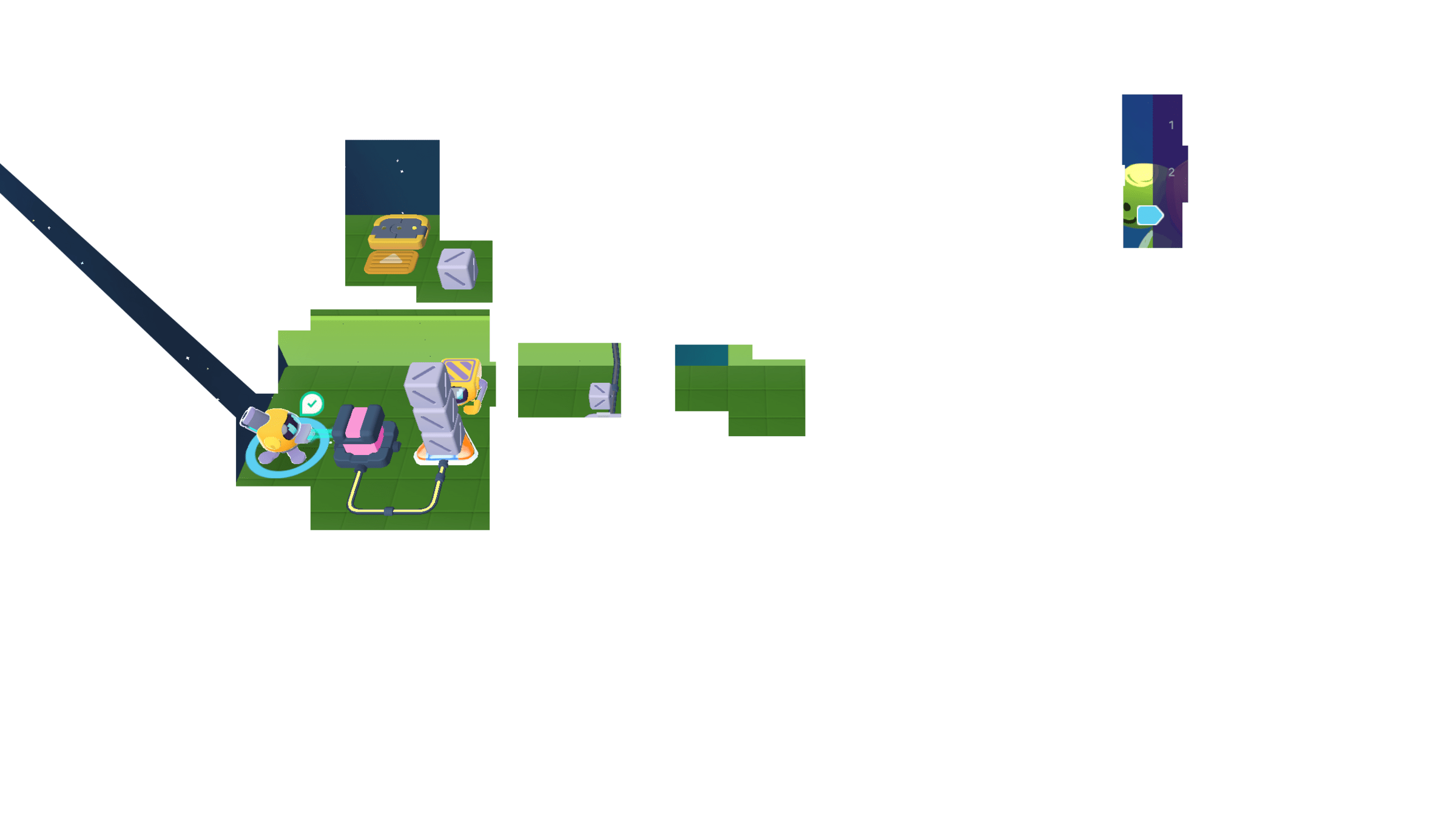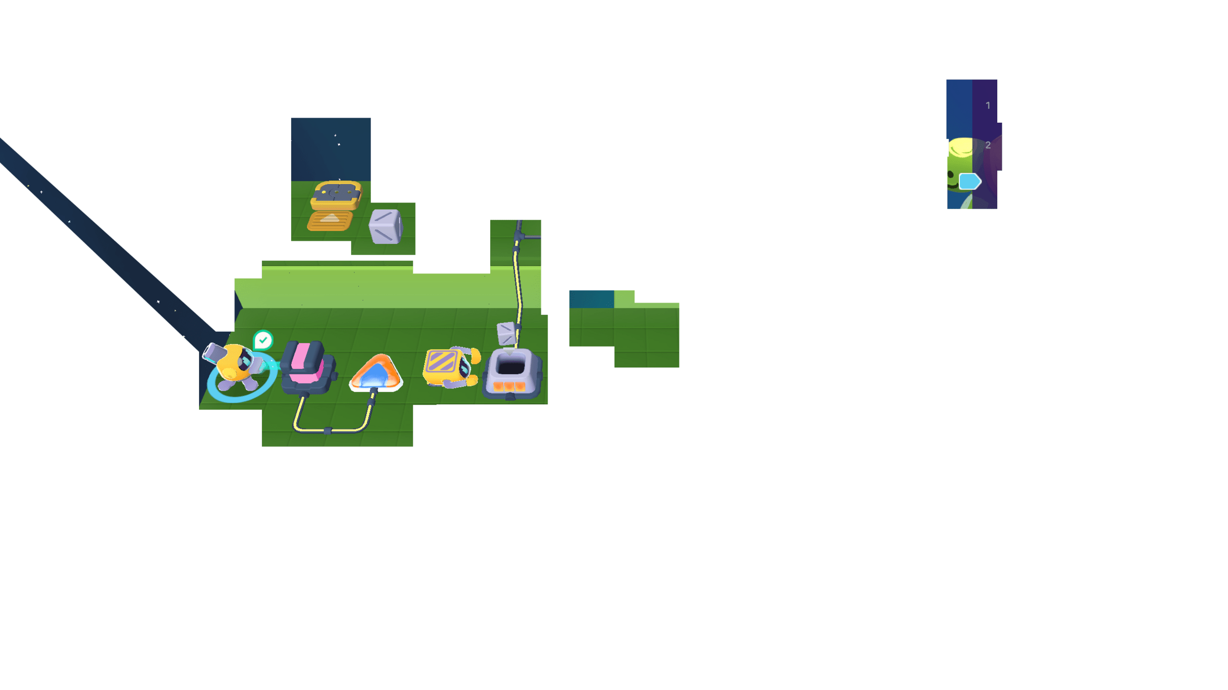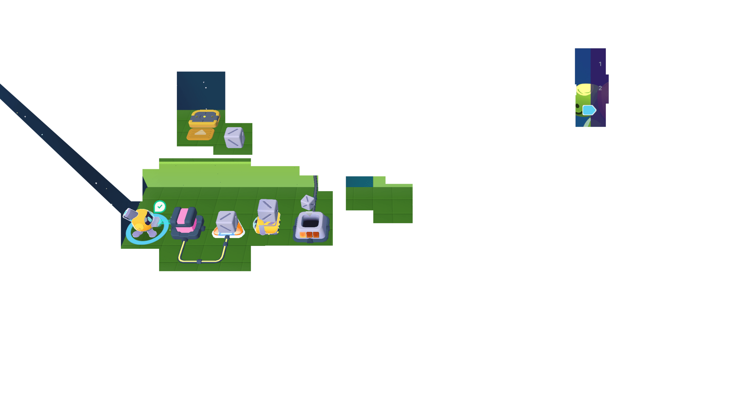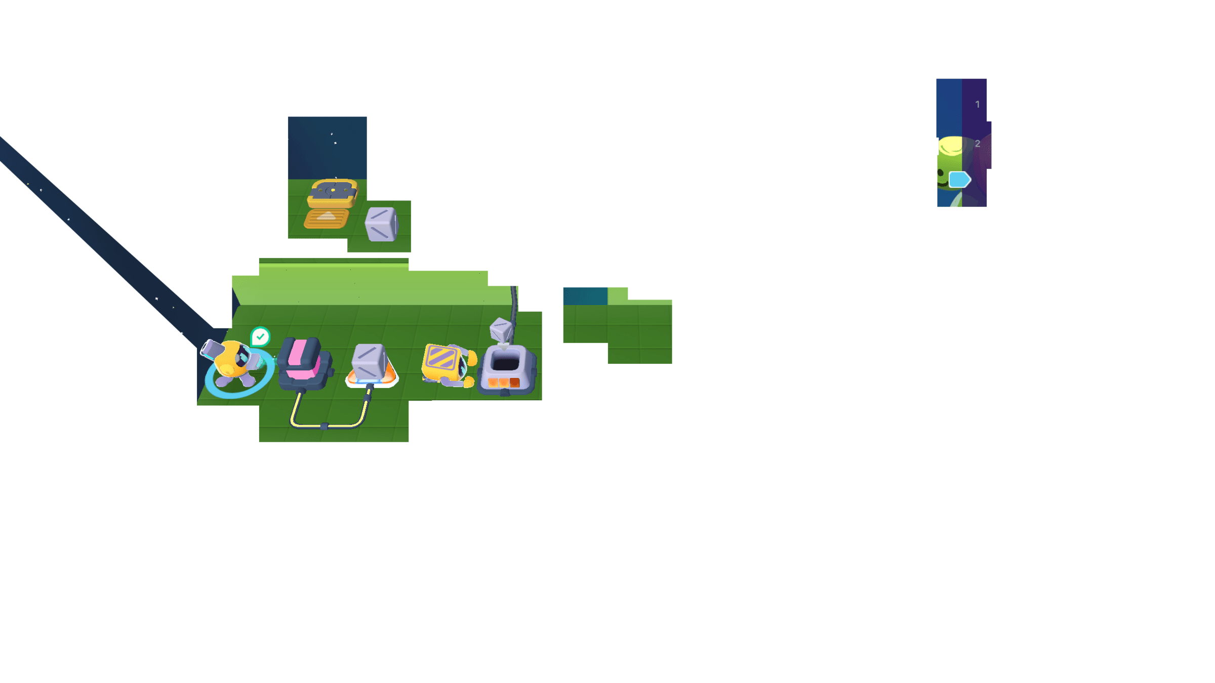 Meanwhile, the Grabber moved the other 3 cubes to the counter. We can cross the bridge now!