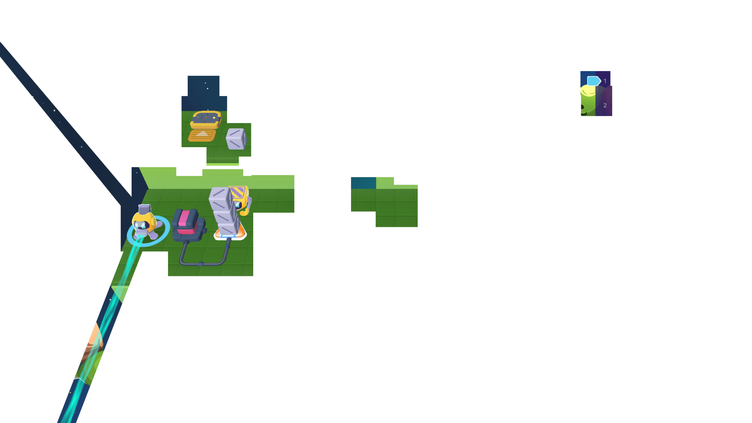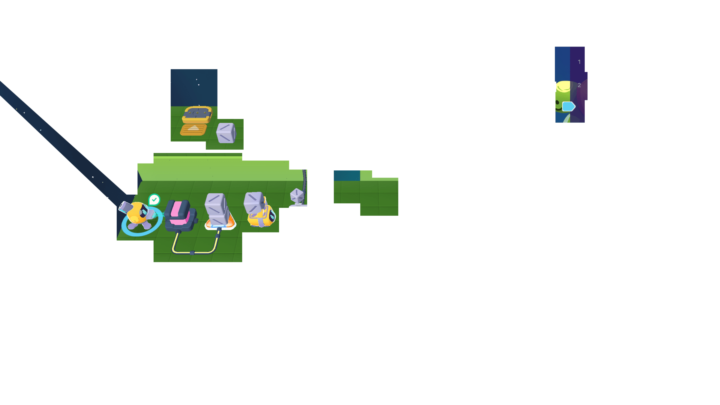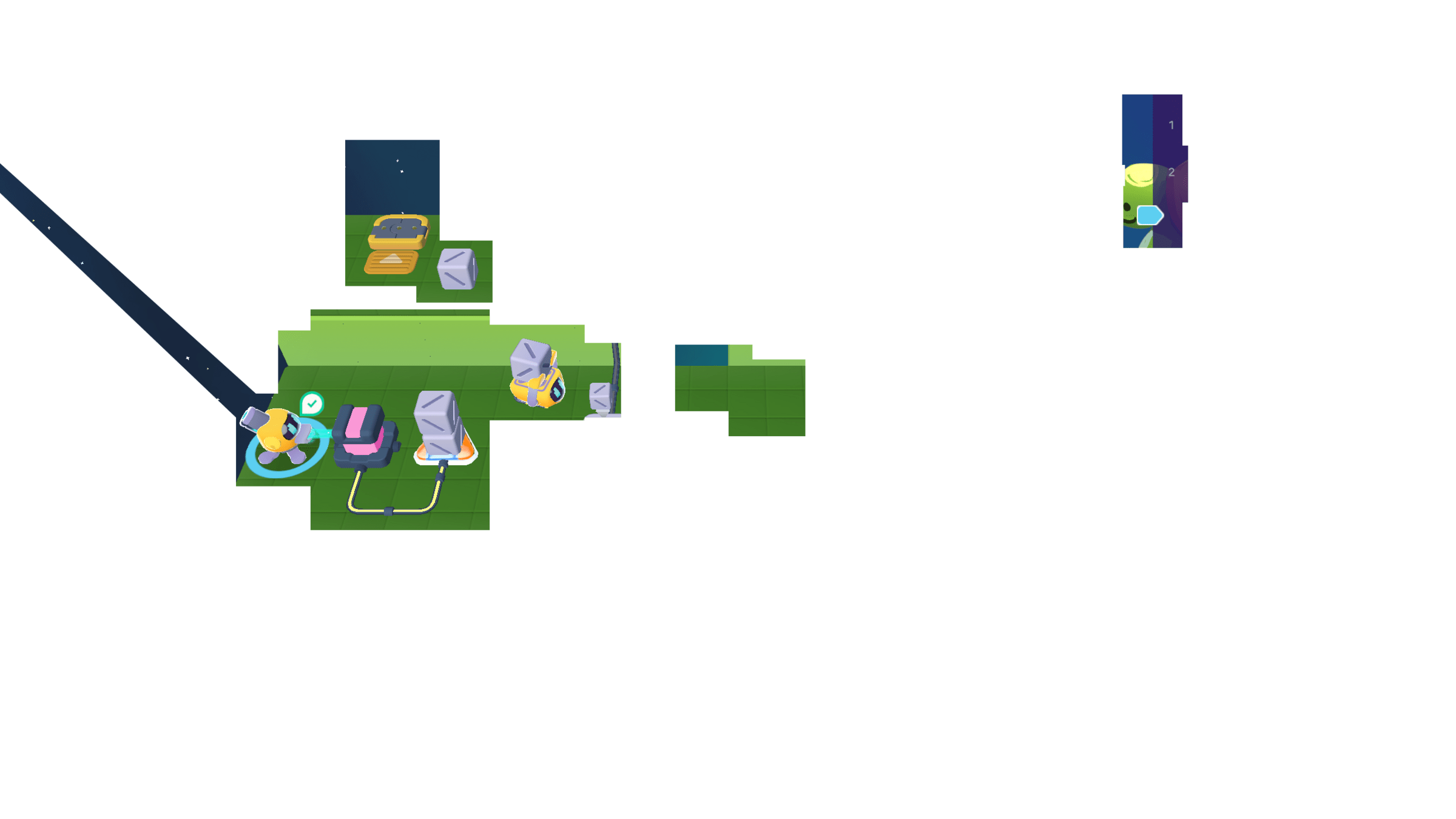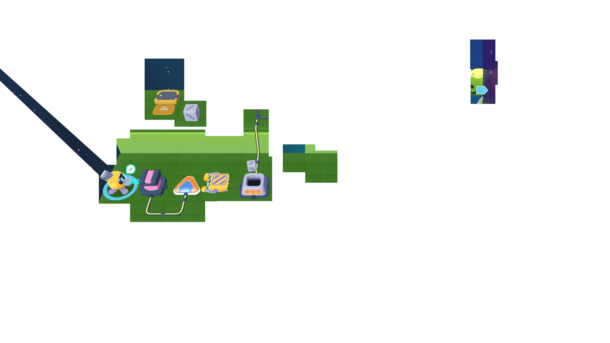 Meanwhile, the Grabber moved the other 3 cubes to the counter. We can cross the bridge now!
