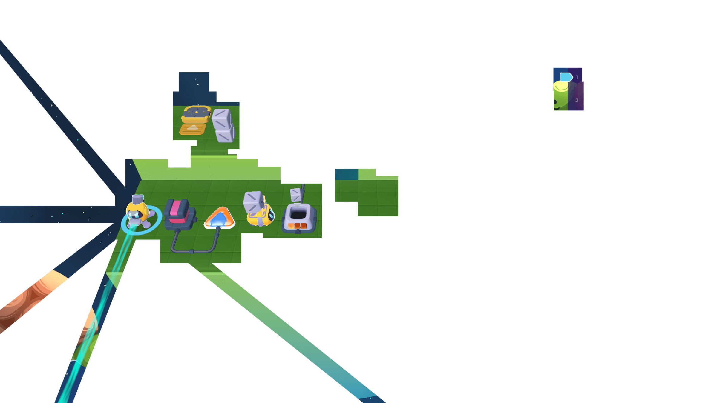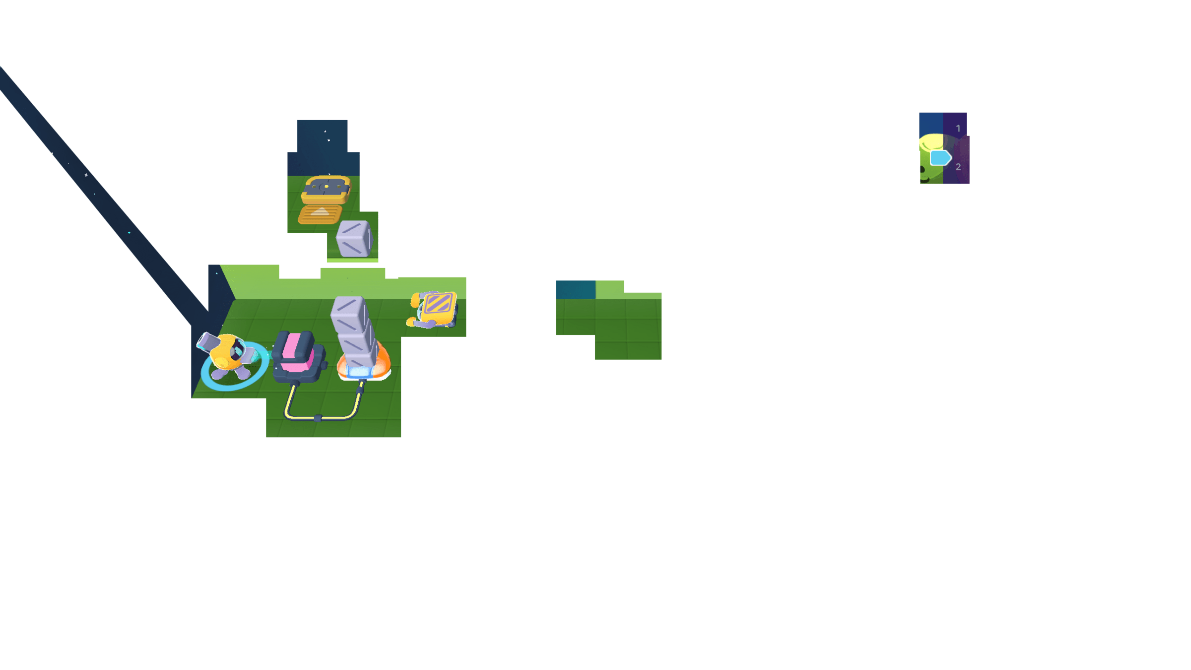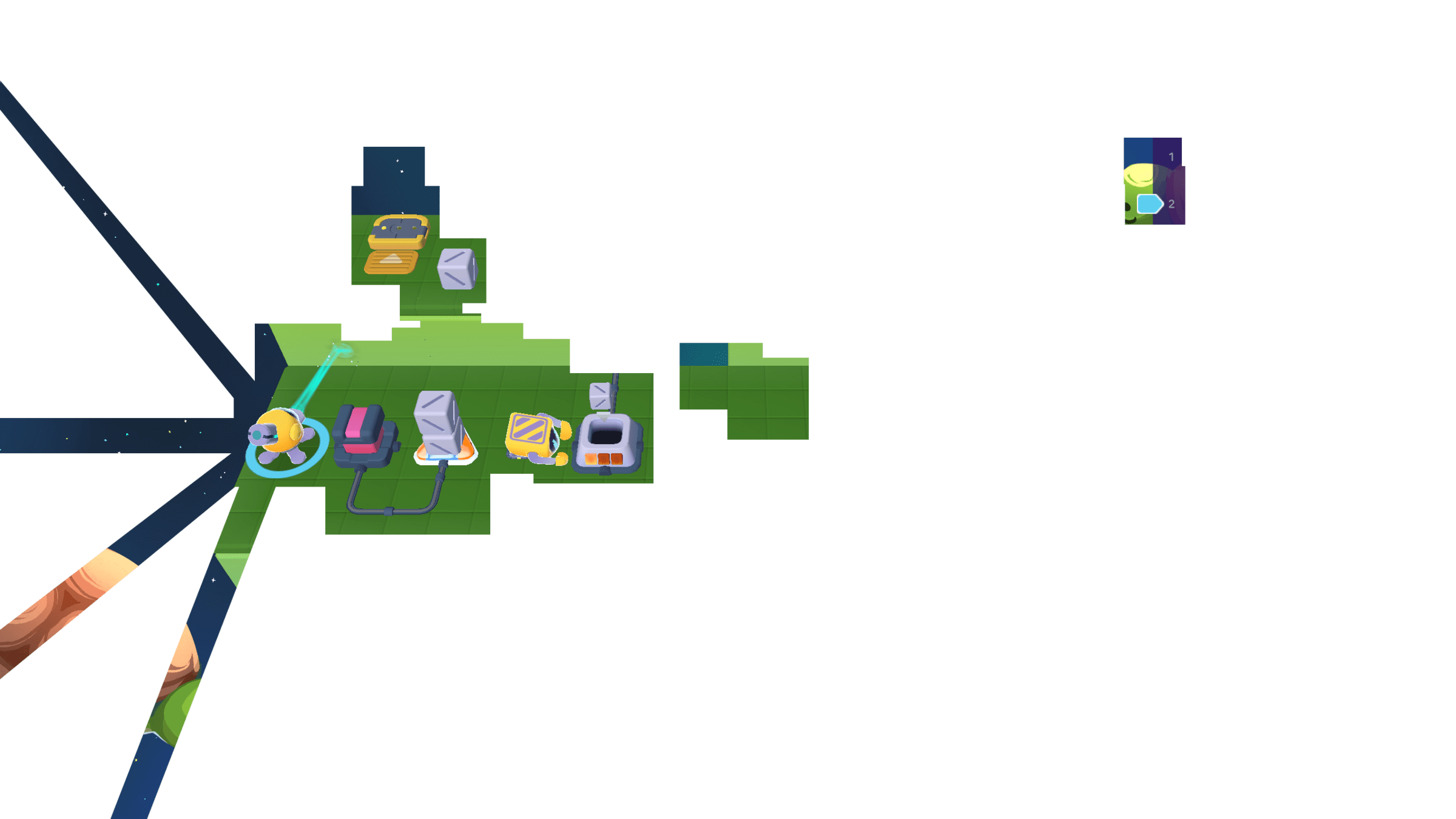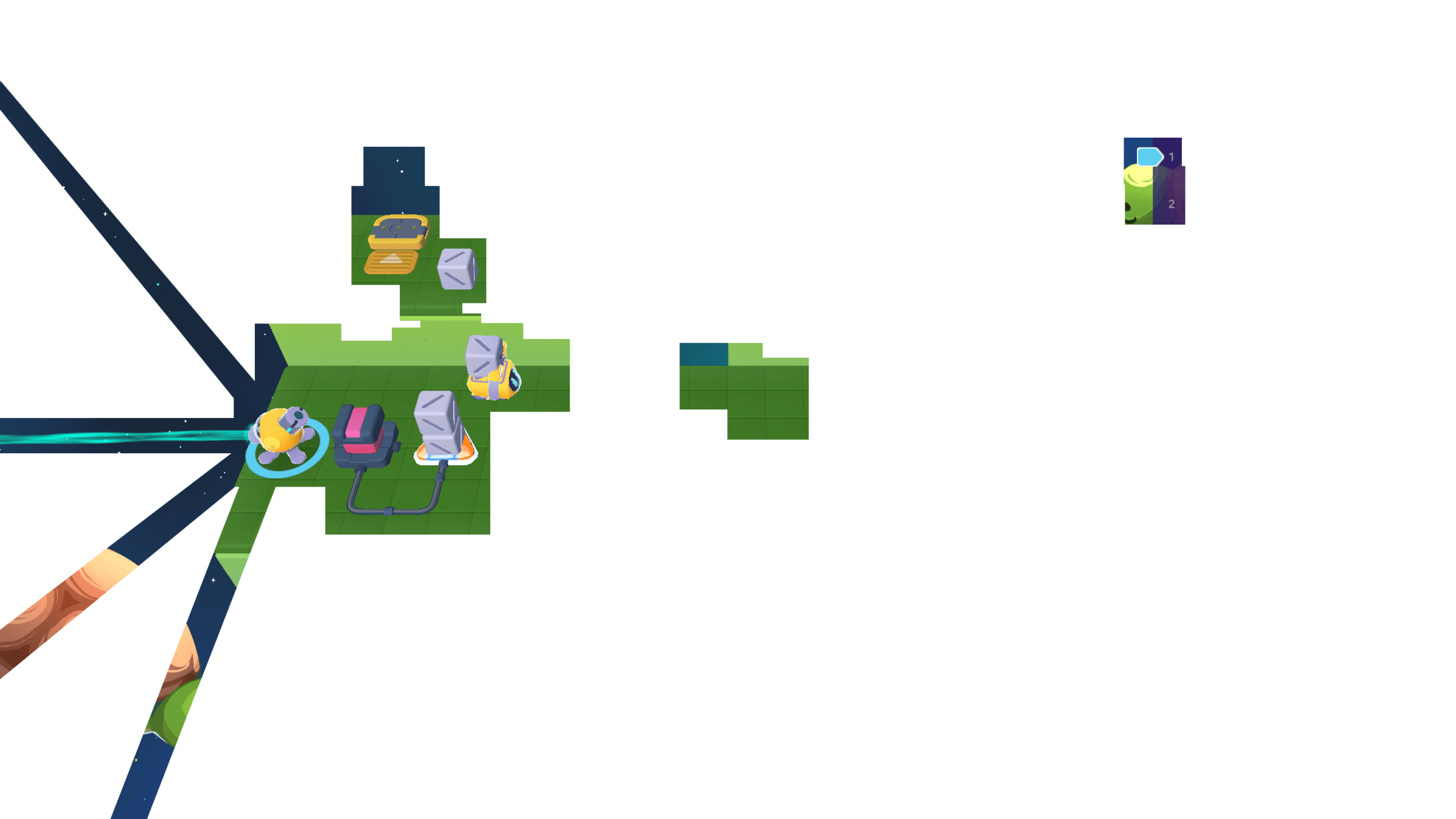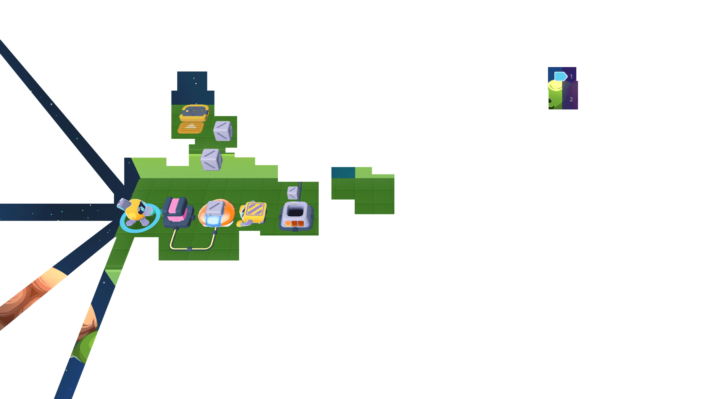Meanwhile, the Grabber moved the other 3 cubes to the counter. We can cross the bridge now!