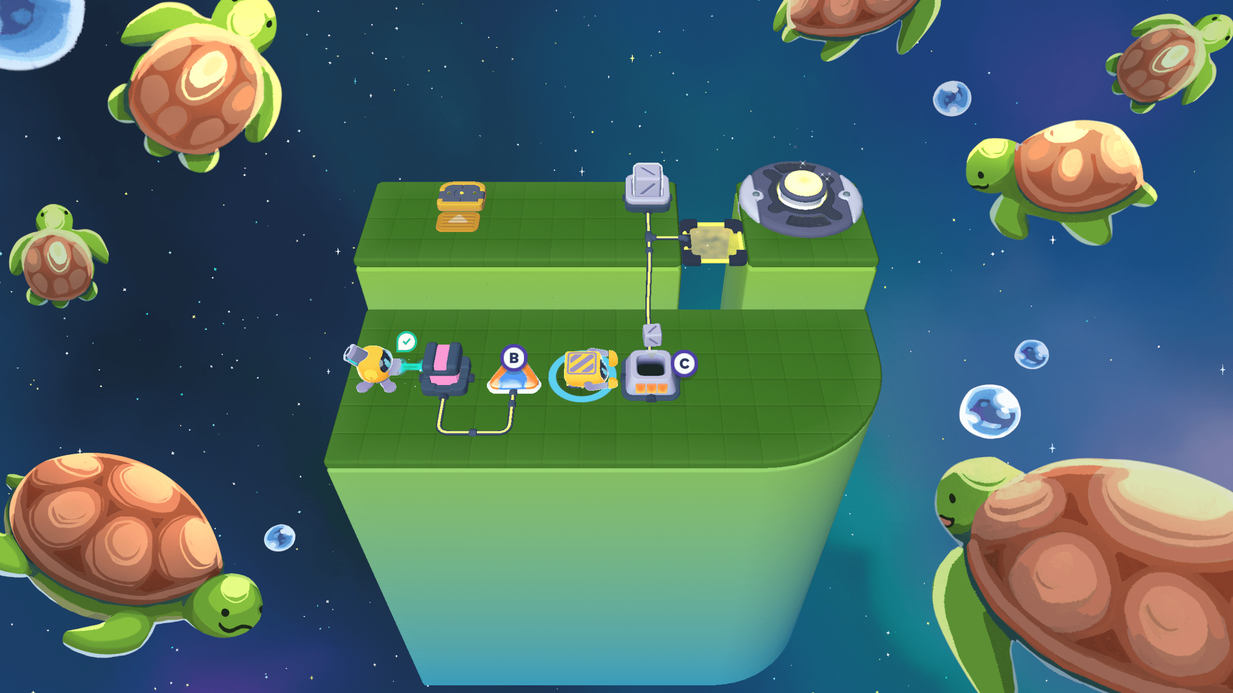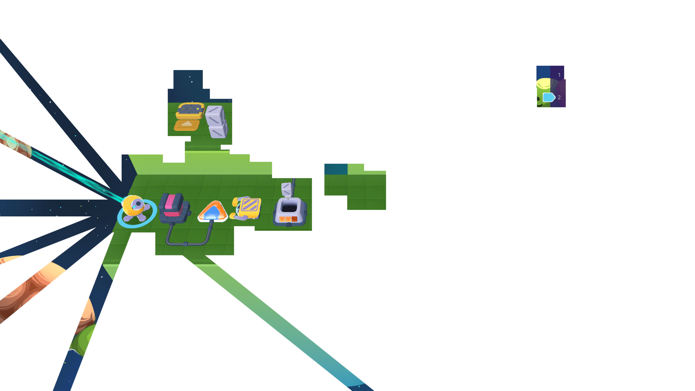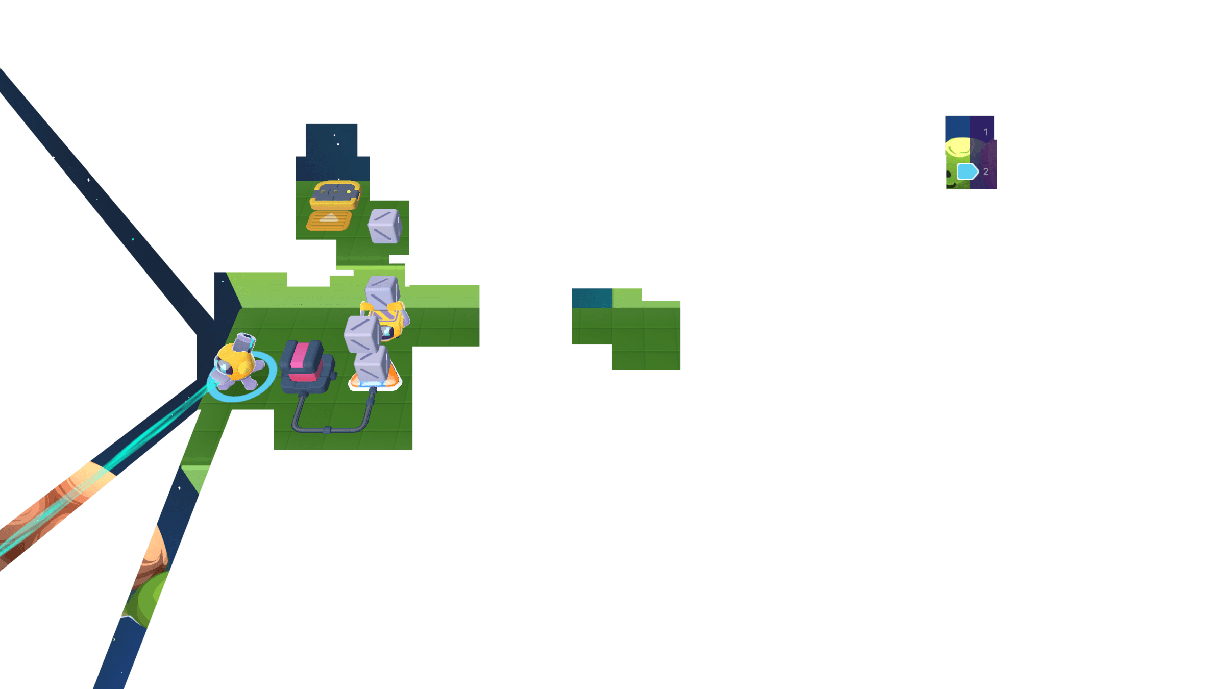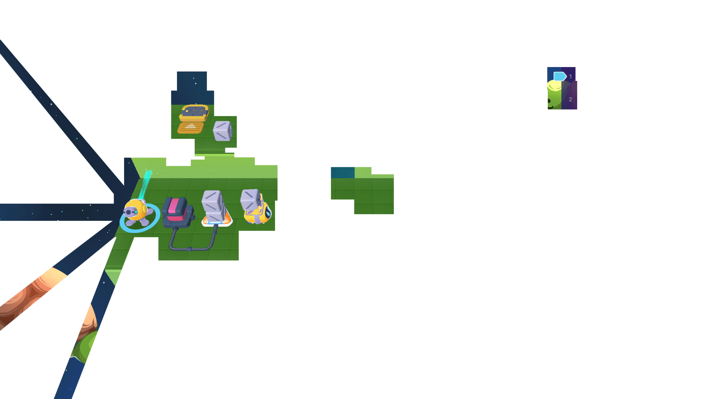 Meanwhile, the Grabber moved the other 3 cubes to the counter. We can cross the bridge now!